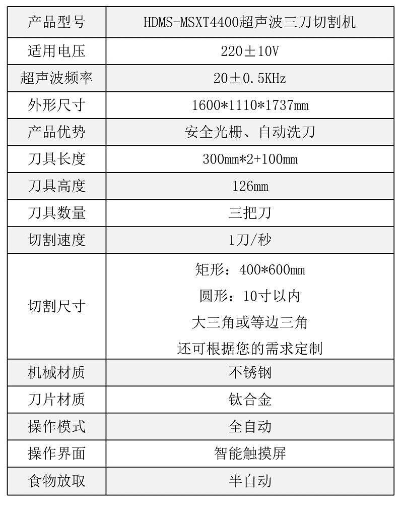該設(shè)備配備單把超聲波刀片,可切圓形(只限一個(gè)圓蛋糕),也可切方形 |