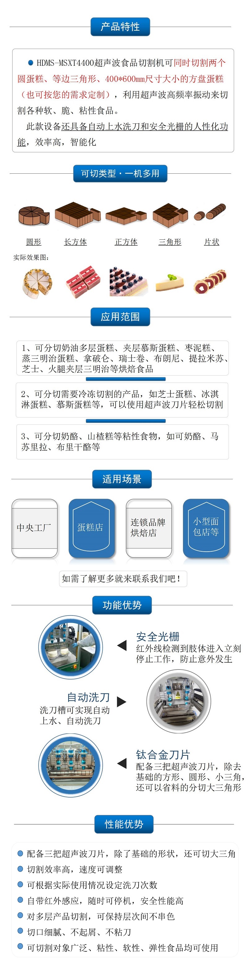 該設(shè)備配備雙把超聲波刀片,既可切方蛋糕,也可同時(shí)切兩個(gè)圓蛋糕,效率更高 |